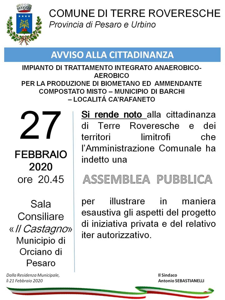 Come già anticipato dal Sindaco, l’Amministrazione Comunale di Terre Roveresche rende noto che il prossimo giovedì 27 febbraio 2020, alle ore 20.45 presso la Sala Consiliare nel Municipio di Orciano di Pesaro, si terrà un’assemblea pubblica per illustrare ed approfondire il progetto di iniziativa privata dell’azienda FERONIA Srl, progetto che prevede la realizzazione di un impianto di trattamento integrato anaerobico-aerobico in un’area adiacente la ex discarica “Cà Rafaneto”. «L’assemblea – spiega il Sindaco Sebastianelli – ha lo scopo di illustrare in maniera precisa e puntuale i dettagli del progetto, dare risposte ai legittimi dubbi che la popolazione si sta ponendo, illustrare e chiarire l’iter della procedura amministrativa. L’importanza dell’argomento richiede un’assemblea con il più ampio coinvolgimento possibile, ovviamente aperta ai cittadini dei territori limitrofi. L’assemblea sarà la sede di dialogo, del confronto costruttivo su aspetti e impatti ambientali, economici, sociali e sanitari di tale progetto». All’Assemblea saranno presenti i tecnici qualificati dell’Impresa Sociale Art. 32 ONLUS, l’Amministrazione Comunale e rappresentanti degli enti locali coinvolti.