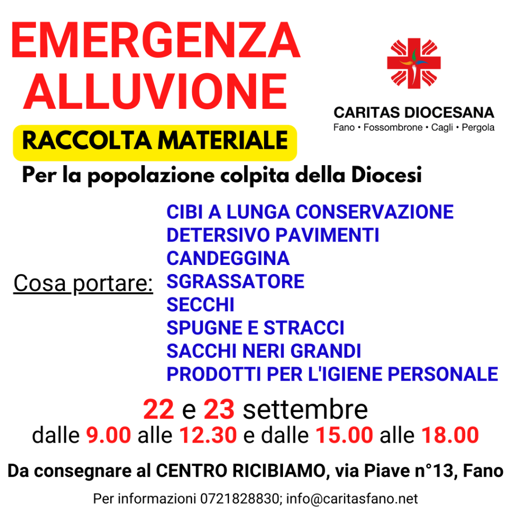 Oggi Giovedì 22 e domani venerdì 23 settembre, presso il Centro Ricibiamo a Fano in Via Piave 13, Caritas di Fano organizzerà una colletta di cibo e di prodotti per le pulizie, per aiutare le persone in difficoltà colpite dall’alluvione.