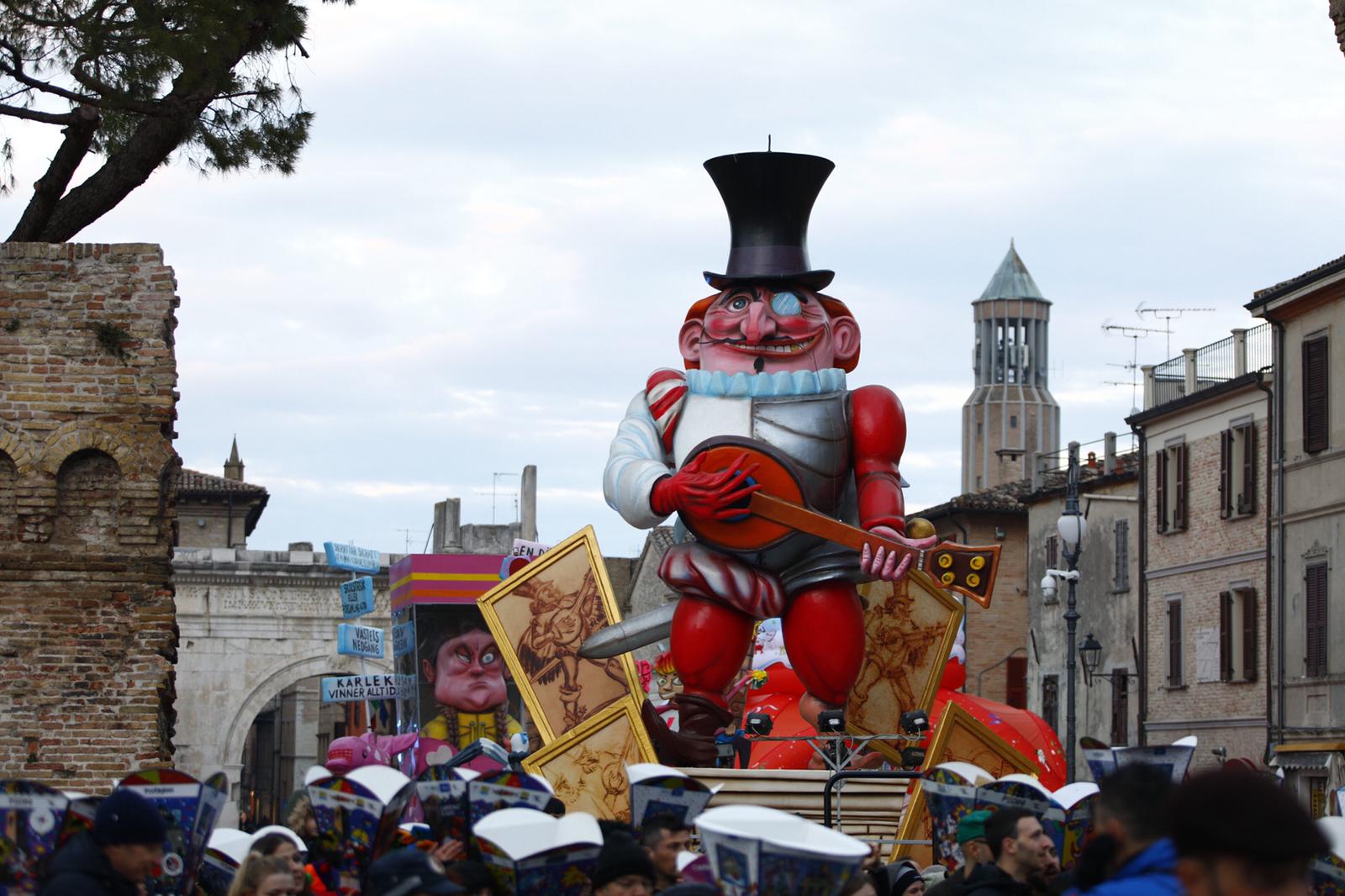 Protagonisti assoluti dell’evento, come di consueto, sono stati loro, i giganti di Cartapesta. Ad aprire il corteo dei carri allegorici ci ha pensato El Vulón, realizzato da Mauro Chiappa dell’associazione Fantagruel che ha condotto la sfilata seguito in successione dalla banda musicale “La Matta” di San Costanzo, “I Giovani: Colore e Motore del mondo!, realizzato dal Liceo Nolfi/Apolloni, Barbie Greta, di Mauro Chiappa e Fantagruel, “La Marcia degli Abbracci gratis di Fano, Super Azzurro, il nuovo carro griffato Pesce Azzurro, il carro di 1^ categoria Carnevale di Fano, realizzato dall’associazione Carnival Factory, il primo carro “Cardioprotetto” nella storia del Carnevale, che ha ospitato le ballerine de Las Chicas Cubana, il piccolo Federico Ielapi, protagonista del Pinocchio di Matteo Garrone e l’attore Giorgio Colangeli. A seguire il mini carro, “Capitan Aset” di Luca Vassilich e Carnival Factory, da un’idea di Henry Secchiaroli, Il carro di 1^ categoria Potenza Inaudita di Matteo Angherà , realizzato assieme all’associazione Carnival Factory, il mini carro a Costa Parchi Edutainment, storico partner del Carnevale di Fano, “Vita Natural Durante” (1^ Categoria), realizzato da Anna Mantovani e da Carnival Factory e “E’ tutto nelle nostre mani” (1^ Categoria) di Valeria Guerra e dell’associazione Gommapiuma. Hanno chiuso la sfilata “Leonardo da Vinci il genio del Rinascimento”, carro realizzato dall’associazione “Montale, un paese da vivere, Amici di Piticchio e Magnadorsa le tre botti”, e “E’ Arabita” di Samanta Bartolucci, carro della Musica Arabita.