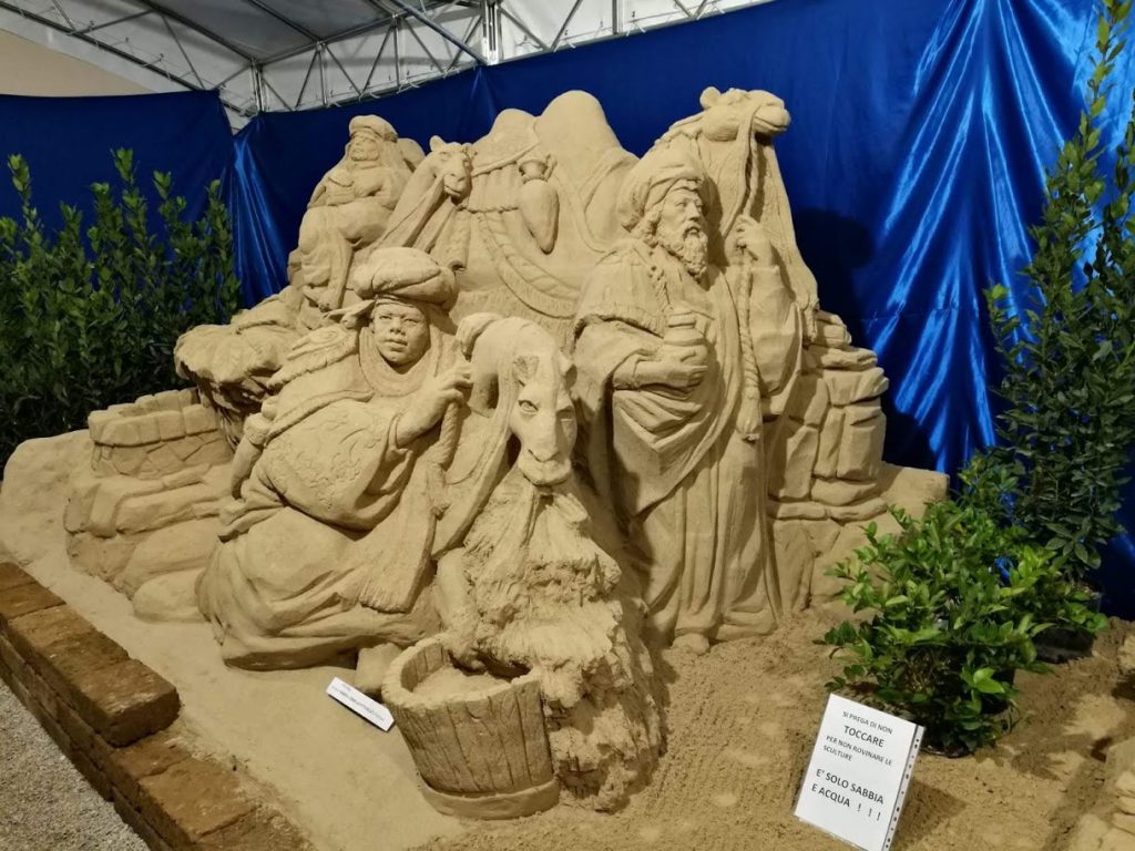 Terminata la cerimonia d’apertura della prima opera, si è passati ad un’altra particolarità del Natale Fanese, che ha attirato anche i media nazionali come la nota trasmissione Rai “La Vita in Diretta”. Stiamo parlando del il “Magic Sand: Il Natale tra le sculture di Sabbia”, un viaggio più che un’opera attraverso i passaggi più importanti della Cristianità, tra antichi mestieri e monumenti storici della città. La struttura di 12 metri per 12, posizionata nei giardini Amiani di fronte alla Mediateca Montanari, si apre con “L’Annunciazione di Maria”, realizzata da Michela Ciappini, nota artista di Cesena che tra le altre opere della sua carriera come scultrice, ha realizzato il Presepe di sabbia presente in Vaticano. Proseguendo nel mondo del Magic Sand, si incontra il primo degli antichi mestieri, un dettagliatissimo falegname alle prese con un ammasso di legna, realizzato dall’artista nostrano Roberto Mancini, il quale si è occupato anche del coordinamento artistico e strutturale di tutto il Presepe, coinvolgendo tutti gli artisti che l’hanno reso possibile. La terza opera vede raffigurato un altro degli antichi mestieri: la Romana Laura Scavuzzo è riuscita a ricreare uno spettacolare venditore di tappeti, talmente dettagliato che sembra quasi muoversi. Proseguendo nel percorso si arriva poi alle 2 sculture più imponenti realizzate a 4 mani dai campioni del mondo ai mondiali di Cervia, Mario e Ornella Vittadello. La prima, che occupa tutto l’angolo della struttura, rappresenta la “Natività”, con Giuseppe, Maria, Gesù, il Bue e l’asinello, oltre ad alcuni dei simboli della Cristianità come il Pavone e la Fonte. Poco più avanti, ad attendere gli spettatori, ci sono i Re Magi, realizzati sempre dalla coppia originaria di Montegrotto Terme, che sono rivolti verso la Natività. A concludere il percorso non poteva mancare uno dei simboli più riconoscibili di Fano: l’Arco d’Augusto. Una scultura realizzata nei minimi particolari da Roberto Mancini, il quale ha prestato la massima attenzione anche ai dettagli che lo rendono praticamente una copia in miniatura dell’originale. Sopra l’Arco, è stato inoltre posizionato un piccolo Angioletto, che guarda verso la “Natività”. Il monumento fanese ospiterà anche quella che rappresenta un po’ la firma di tutti gli artisti i quali hanno voluto incidere la frase “Creativity, Intelligentia Est Habens Fun” di Alfred Einstein che significa “La creatività è l’intelligenza che si diverte”.
