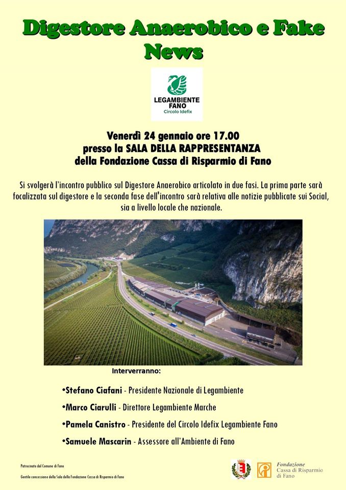 E’ previsto per venerdì 24 gennaio alle ore 17, presso la Sala di Rappresentanza della Fondazione Carifano, il prossimo incontro di Legambiente Fano, dal titolo “Digestore e Fake News”, tutto quello che c’è da sapere sul funzionamento di un Digestore Anaerobico, i pro e i contro, le possibilità che offre dal punto di vista economico e ambientale e aprire un confronto con le domande della cittadinanza che parteciperà.