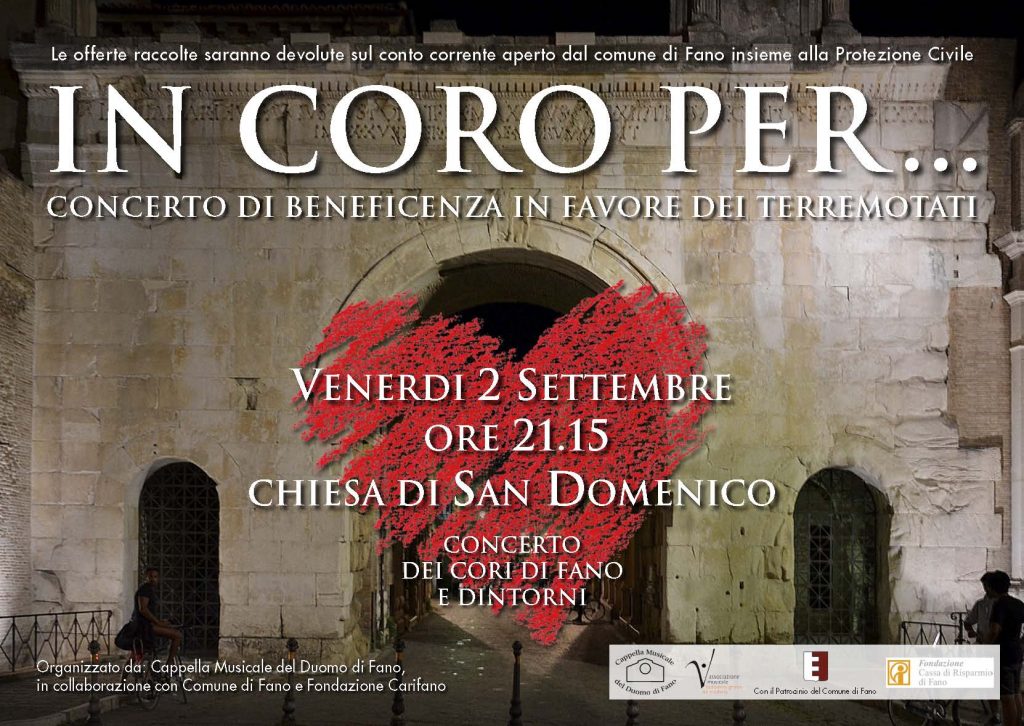 Venerdì 2 agosto 2016, ore 21.15, Pinacoteca di San Domenico Fano – UN CORO PER…Concerto di beneficenza in favore dei terremotati.