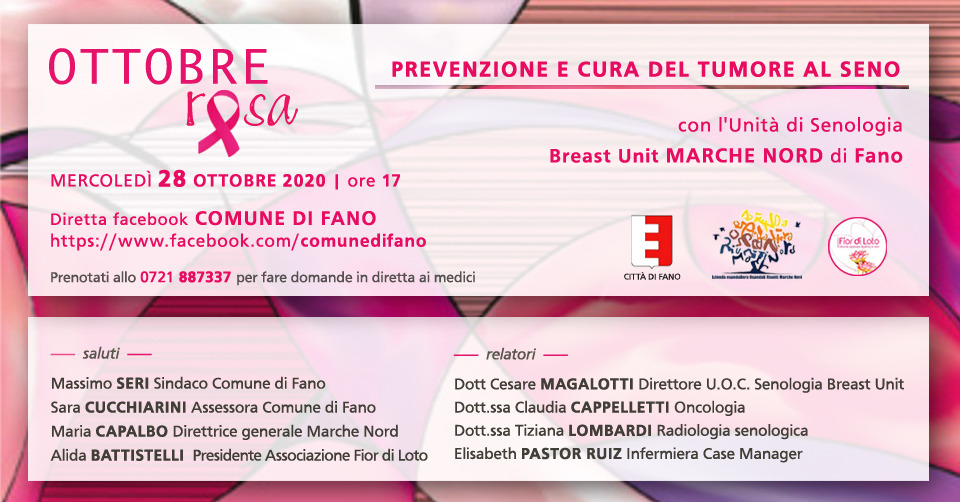 Nell’ambito di “Ottobre Rosa”, il mese di prevenzione e cura del tumore al seno al quale la città di Fano aderisce anche attraverso l’illuminazione nelle ore serali di alcuni monumenti simbolo, come la fontana di Piazza XX Settembre e l’Arco d’Augusto, l’assessorato alle Pari Opportunità organizza mercoledì 28 ottobre un appuntamento di divulgazione scientifica volto alla prevenzione, con l’Unità di Senologia Breast Unit Marche Nord di Fano.