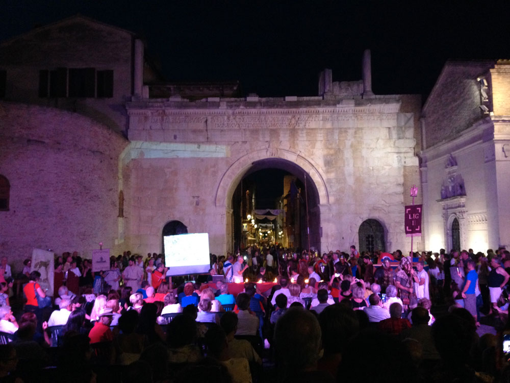 L’accensione del braciere è stata anticipata da un corteo composto dagli elementi sopracitati, che è partito da Piazza XX Settembre intorno alle 20.45, ed ha sfilata fino fare il suo ingresso trionfale passando sotto l’Arco d’Augusto dove ad attenderlo c’erano un migliaio di persone.