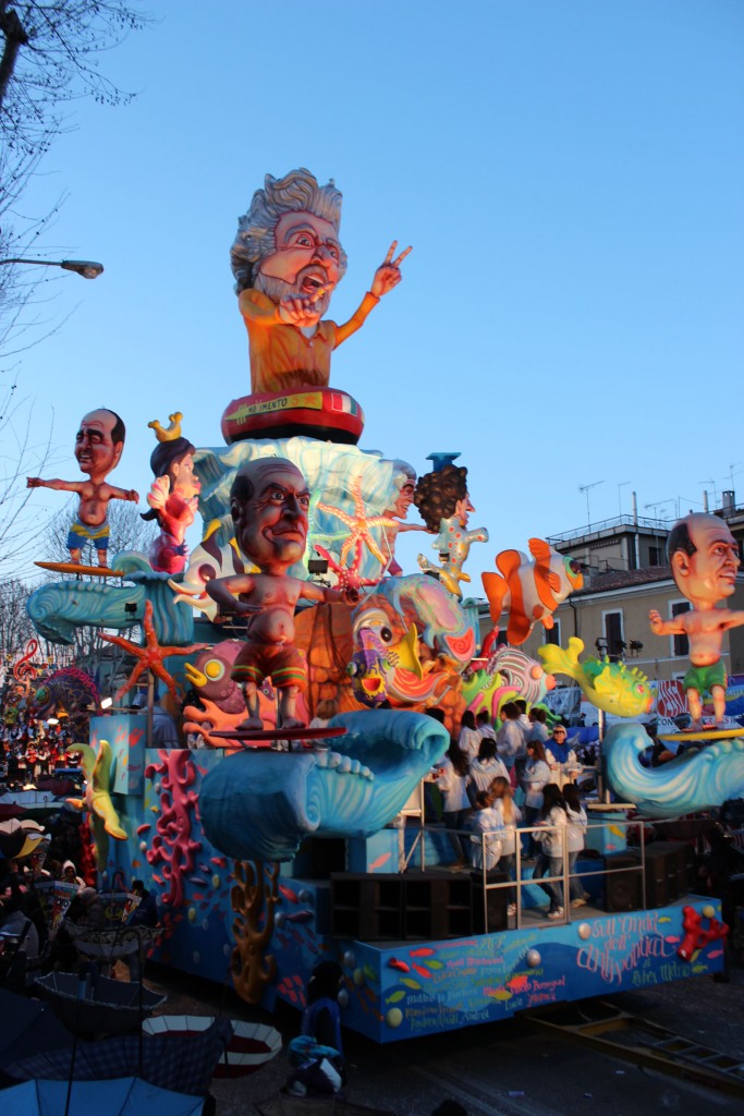 Lo scatto che ritrae il carro dell’edizione 2013 è stato pubblicato nella tavola fuori testo della sezione Società e Politica e ritrae Beppe Grillo che padroneggia sul carro ideato dal maestro Ruben Eugenio Mariotti e che naviga sicuro a bordo di un canotto sulle onde dei consensi dell’opinione pubblica. Il comico è seguito a ruota dai politici di turno che cavalcano le onde dell’antipolitica in bermuda, su una tavola da surf.