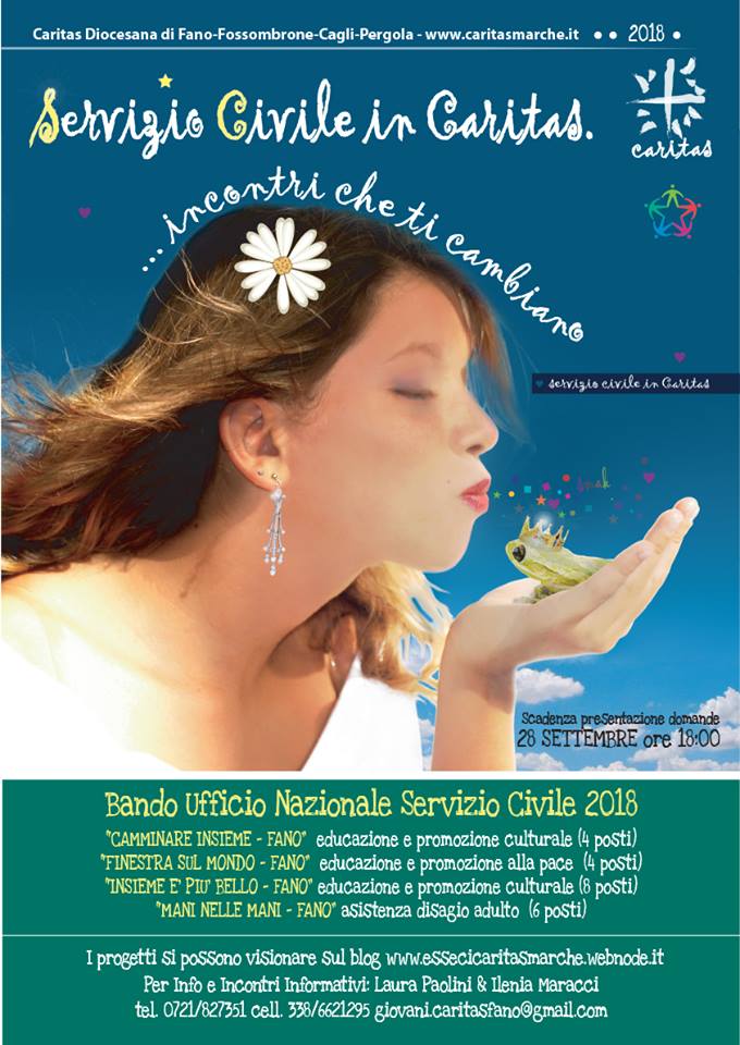 La Caritas Diocesana di Fano Fossombrone Cagli Pergola offre la possibilità, ai giovani fra i 18 e i 28 anni, di vivere un anno di servizio civile immerso nei suoi servizi. Quest’anno sono 4 i progetti finanziati: Centro d’ascolto diocesano, Centro documentazione “Sala della Pace”, Centro diurno per adolescenti e quattro oratori parrocchiali di Torrette, S.Orso, San Lazzaro, Cuccurano, per un totale di 22 posti. I progetti completi si possono visionare sul blog essecicaritasmarche.webnode.it.