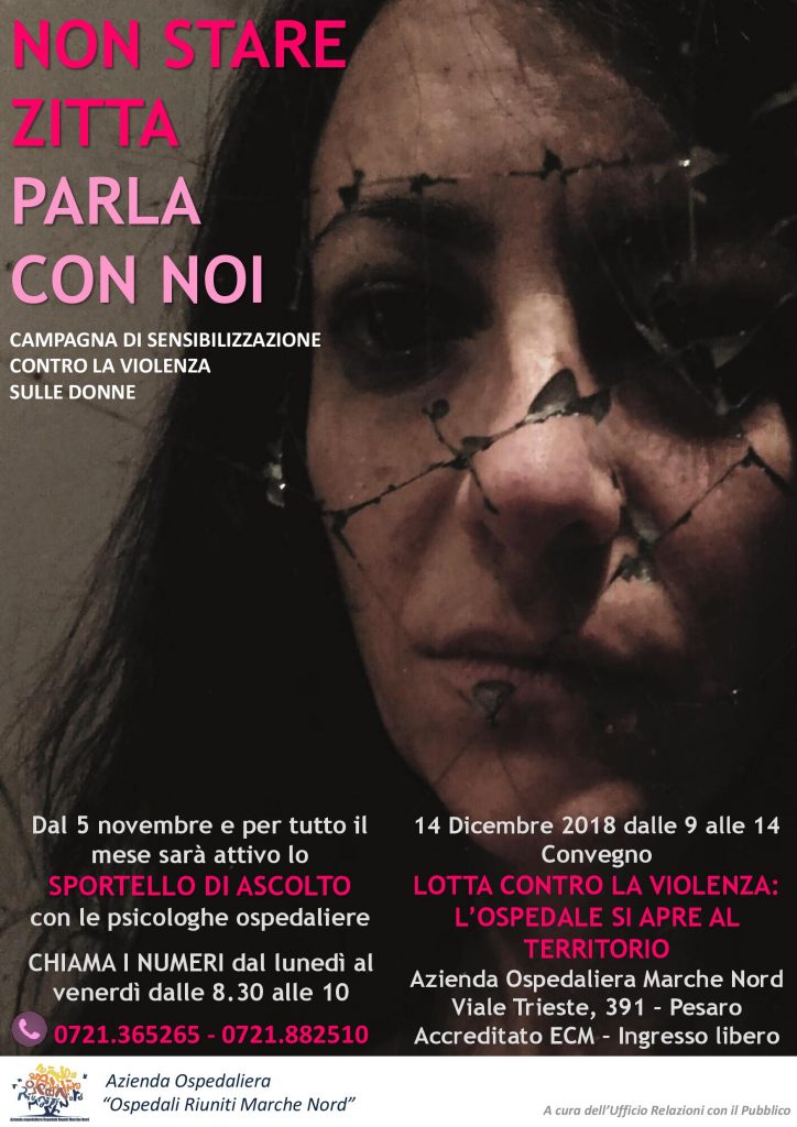 A chiudere la campagna di sensibilizzazione un convegno dal titolo “Lotta contro la violenza: l’ospedale si apre al territorio”, che avrà luogo il 14 dicembre 2018 dalle 9 alle 14 presso la sede dell’Azienda Ospedaliera di Viale Trieste 391. Interverranno il Sostituto Procuratore del Tribunale di Pesaro Dr.ssa Silvia Cecchi, il Coordinatore dell’Associazione Italiana Psicologia e Criminologia di Roma Dr. Massimo Lattanzi e il Direttore del Pronto Soccorso di Marche Nord Dr. Stefano Loffreda. Il convegno, accreditato ECM, è rivolto agli operatori sanitari e aperto ai professionisti della rete antiviolenza e alla cittadinanza intera.