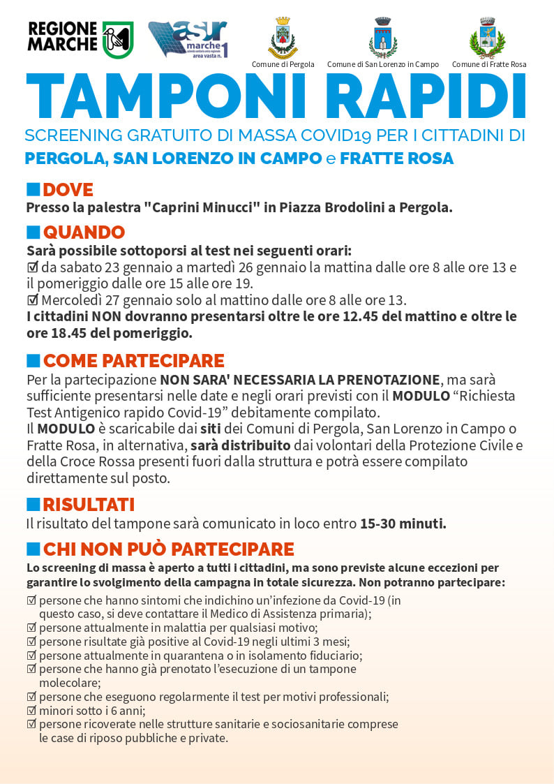 Lo screening è completamente gratuito e l’esito del tampone sarà comunicato entro massimo 15/30 minuti. Sarà sufficiente presentarsi nelle date e negli orari previsti con il modulo “Richiesta Test Antigenico rapido Covid-19” debitamente compilato. E’ scaricabile nei siti internet dei Comuni. Il modulo sarà inoltre distribuito dai volontari della Protezione Civile e della Croce Rossa presenti fuori dalla struttura (Palestra di Pergola) e potrà essere compilato direttamente sul posto.