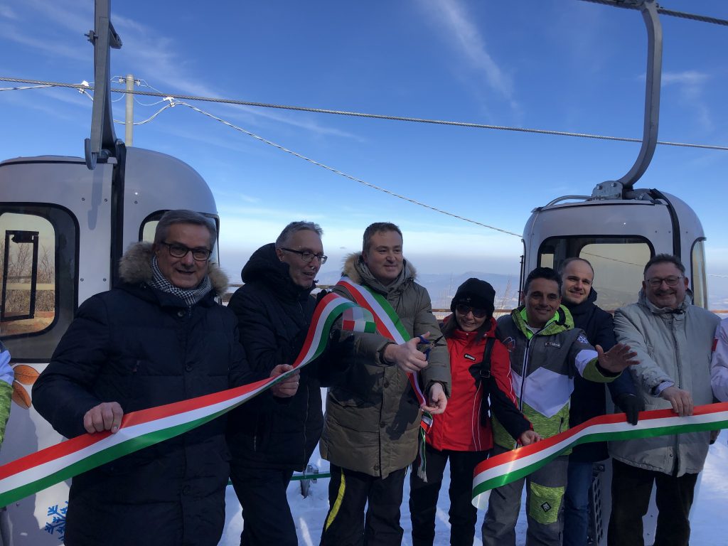 FRONTONE – Taglio del nastro sabato della nuova cabinovia del Monte Catria: erano presenti il Presidente della Regione Marche, Luca Ceriscioli, il vice presidente del Consiglio Regionale, Renato Claudio Minardi, il sindaco di Frontone Francesco Passetti e i responsabili della società che gestisce l’impianto, Michele Oradei e Mirco Ravaioli.