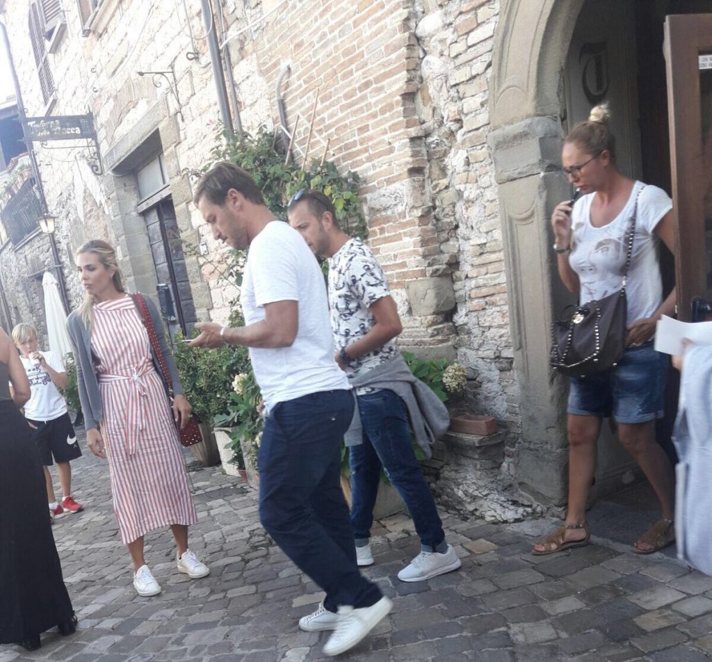 Hanno scelto la tranquillità di Frontone Francesco Totti e Ilary Blasi per staccare la spina dai rispettivi impegni. Nel paese ai piedi del Catria, dove sono nati i genitori della showgirl e conduttrice televisiva, abitano dei parenti che spesso Ilary viene a trovare. Qualche giorno di relax, passeggiate, aria buona e un salto in uno dei rinomati ristoranti del castello, la “Taverna della Rocca”, per degustare le tipiche specialità frontonesi: tagliatelle, crescia e carne alla brace. La loro presenza, ovviamente, non è passata affatto inosservata e nel giro di pochi minuti tanti curiosi e fans del campione giallorosso, ora dirigente della Roma, sono arrivati al castello per foto ricordo e autografi che Totti, con la consueta simpatia, ha concesso. Ieri sono saliti anche in alta quota, fino al rifugio Monte Catria Cotaline 1400. Anche qui i due sono stati molto disponibili per foto e autografi.