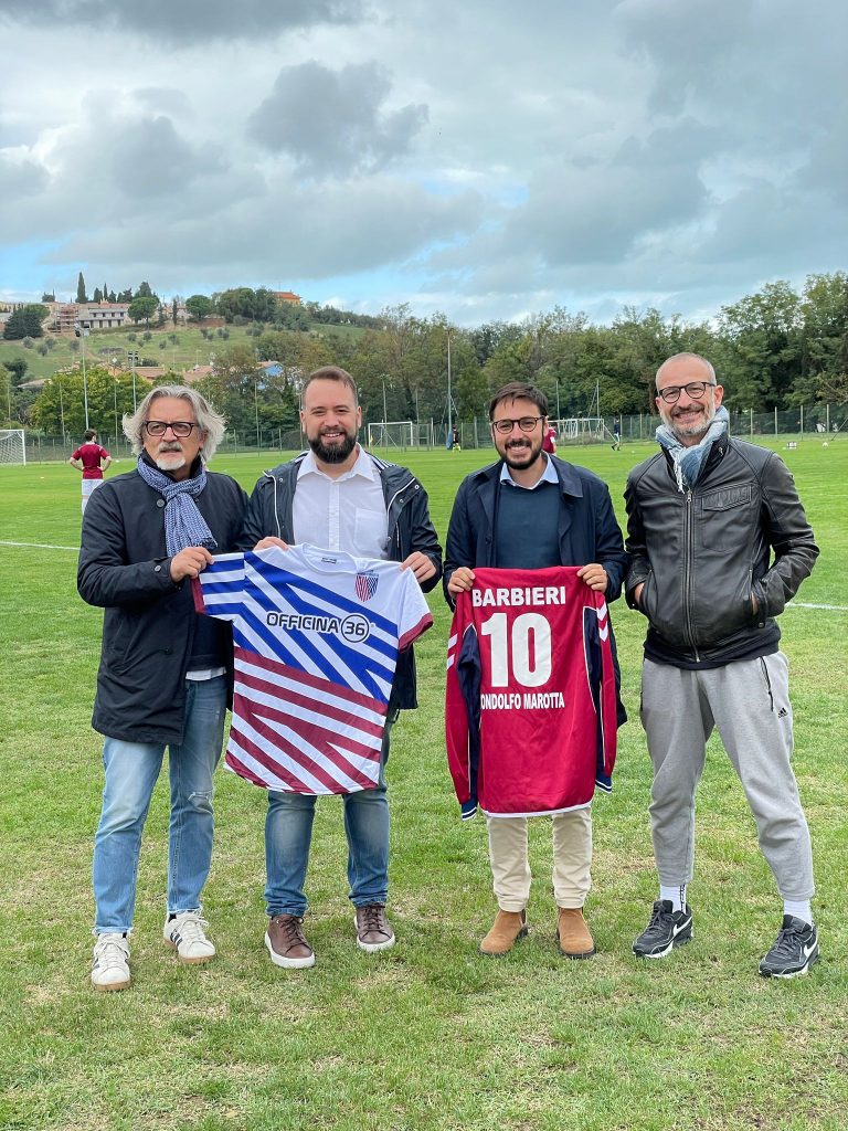 Presente allo stadio anche Luca De Minicis della Dmp Concept di Marotta, che con Lucia Mencaccini hanno realizzato la nuova veste grafica della società, il logo dell’Atletico e dell’Academy MarottaMondolfo e le divise da gioco. “È stata davvero una grande soddisfazione realizzare un logo per una realtà sportiva così importante e attiva per il nostro territorio. Ho pensato a un ‘intreccio’ grafico da cui emerge una M, a rappresentare la fusione delle due società in una singola icona con i rispettivi colori sociali, il granata e il blu. Il perimetro ricalca quello di uno scudo araldico, ma con uno stile decisamente contemporaneo che richiama a una forte vocazione al futuro. Lo stesso motivo è stato utilizzato sul materiale istituzionale e promozionale della squadra e sulle divise, dove la trama del logo viene esagerata e inclinata per dare dinamicità e rendere in grafica il movimento dei giocatori, con un effetto finale d’impatto, ben visibile e riconoscibile in campo”.