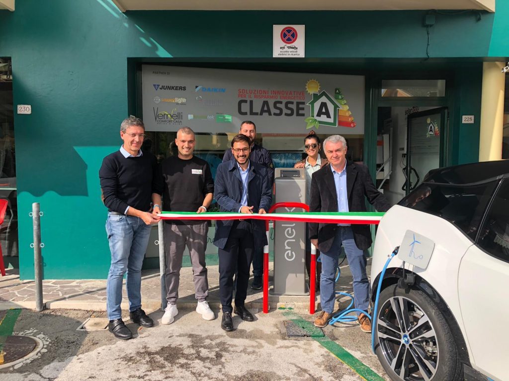 La realizzazione di questo progetto è stato possibile grazie all’Ing. Federico Giovannelli di “Classe A” che ha messo a disposizione dell’azienda leader per la mobilità elettrica (ENEL X), due posti auto situati davanti alla sua attività commerciale.