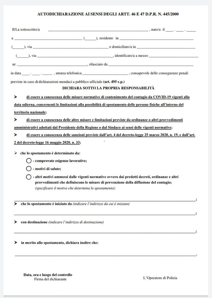 Il modulo, già disponibile sul sito del Viminale, è lo stesso che era stato predisposto in occasione del Dpcm del 24 ottobre e già utilizzabile per le ordinanze in vigore nelle Regioni dove era stato stabilito il coprifuoco. Si tratta di un modello standard – che avranno a disposizione tutte le pattuglie delle forze di polizia – dove i cittadini dovranno indicare i motivi dello spostamento. I controlli verranno fatti a campione e chi non riuscirà a dimostrare il motivo indicato nell’autocertificazione, verrà denunciato, come riporta l’Ansa.