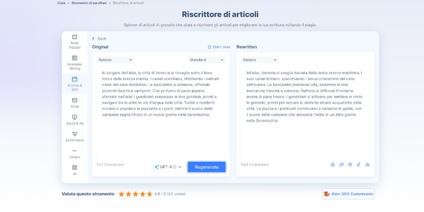Per uno scrittore di contenuti impegnato, essere in grado di riutilizzare i contenuti può significare risparmiare molto tempo nella ricerca di nuove idee, nella scrittura di testi e nella modifica dei contenuti. Ad esempio, se bai a questa pagina e usi lo strumento di riscrittura, le parole che inserisci verranno sostituite con sinonimi, il tono dell’articolo verrà cambiato per adattarlo al pubblico di riferimento e anche la lingua potrà essere modificata con precisione, tutto a tuo vantaggio.