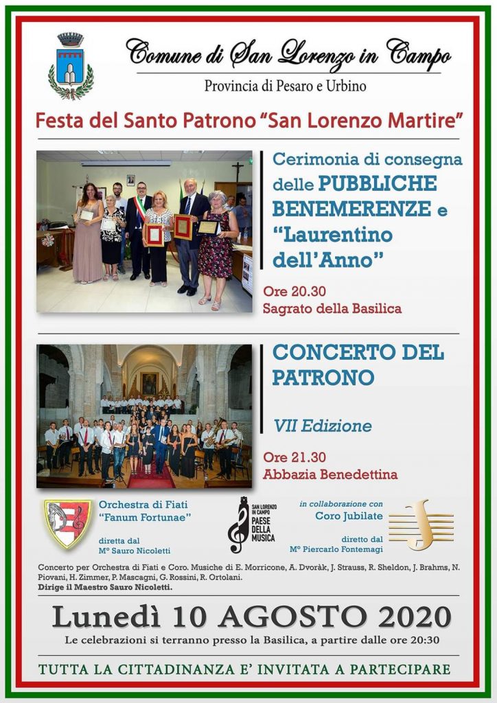 Alle 21.30, ci si sposterà nella splendida Abbazia benedettina per la settima edizione del Concerto del Patrono. Si esibiranno l’orchestra di fiati “Fanum Fortunae” diretta dal Maestro Sauro Nicoletti e il Coro Jubilate di San Lorenzo in Campo diretto dal Maestro Piercarlo Fontemagi.