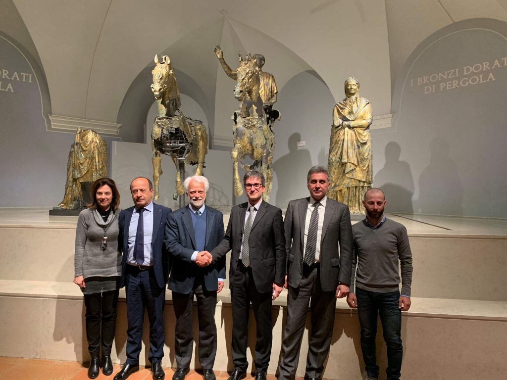 I Bronzi dorati raccontano la loro storia: un viaggio nel passato, tra arte e cultura, emozionante e coinvolgente. E’ stata aperta al museo di Pergola (Pesaro Urbino), dopo gli importanti lavori di rifunzionalizzazione e gestione realizzati dall’Amministrazione comunale, la nuova sala immersiva che ospita l’unico gruppo in bronzo dorato giunto dall’età romana sino ai giorni nostri. Ideatore e direttore dei lavori Paco Lanciano, professionista di fama internazionale, consulente di Piero Angela, di Quark e Superquark, che ha realizzato, fra l’altro, l’allestimento delle Domus Romane di Palazzo Valentini, dei Fori di Augusto e di Cesare ai Fori Imperiali.