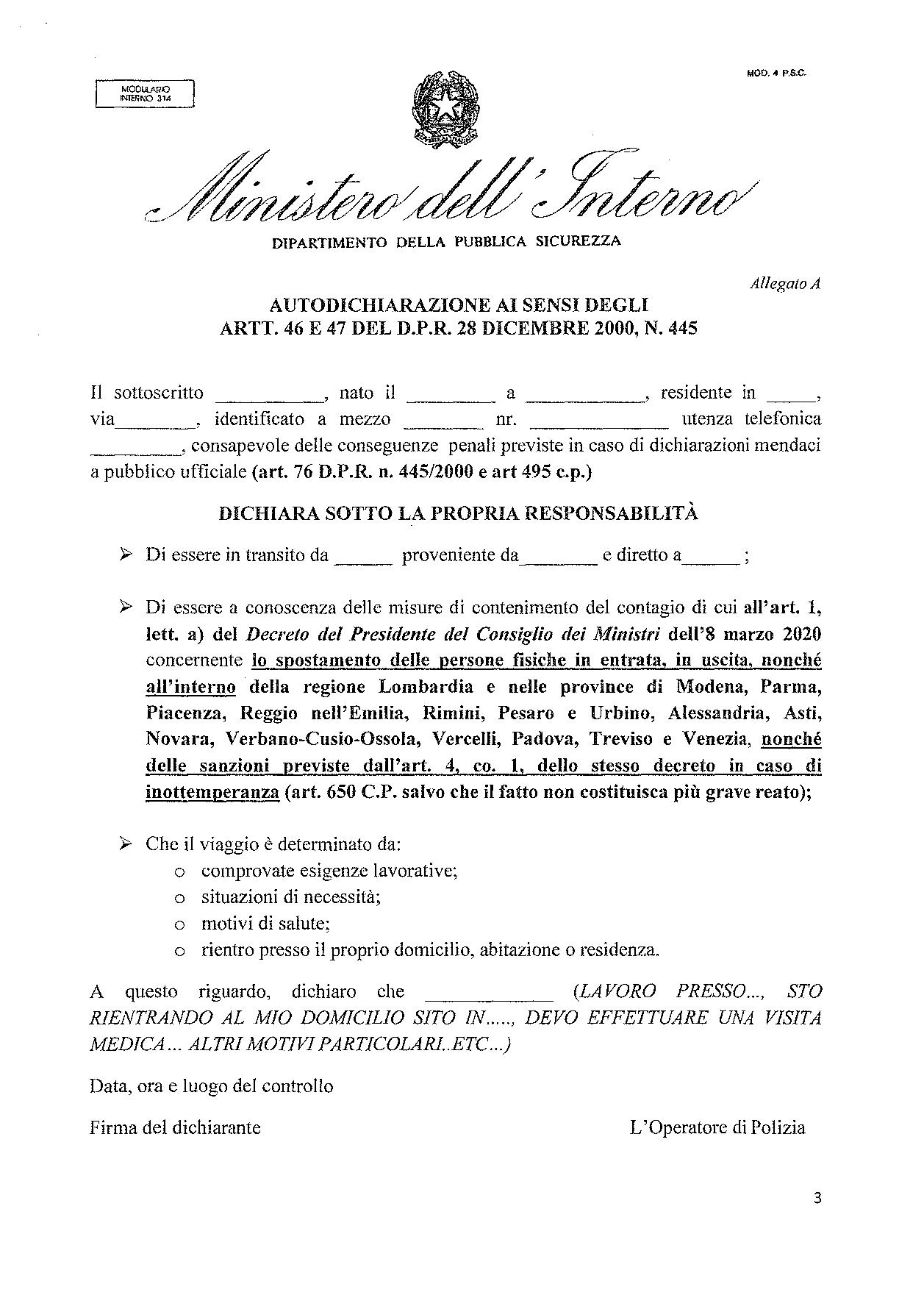 a) gli spostamenti potranno avvenire solo se motivati da esigenze lavorative o situazioni di necessità o per motivi di salute da attestare mediante autodichiarazione, che potrà essere resa anche seduta stante attraverso la compilazione di moduli forniti dalle forze di polizia. Un divieto assoluto, che non ammette eccezioni, è previsto per le persone sottoposte alla misura della quarantena o che sono risultate positive al virus.