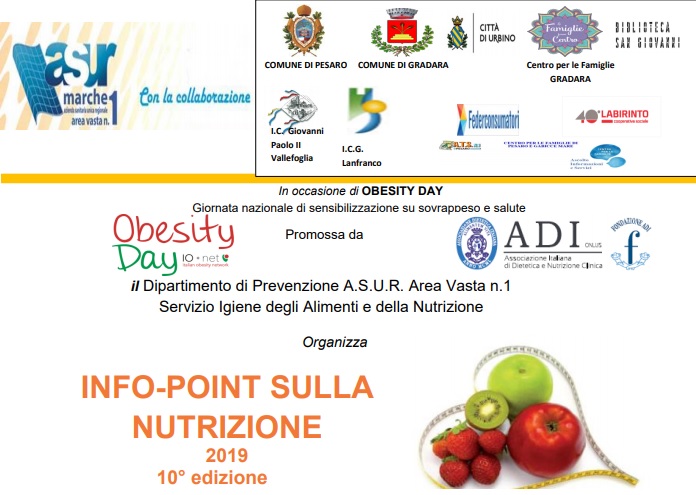 Nell’Area Vasta 1 è stato raggiunto l’importante traguardo della decima edizione di INFOPOINT sulla NUTRIZIONE, manifestazione nata a Pesaro nel 2010, su iniziativa dell’U.O.S Igiene della Nutrizione, centro accreditato Obesity Day per la Provincia Pesaro-Urbino, quale ampliamento locale dell’iniziativa nazionale Obesity Day, promossa dall’Associazione Italiana di Dietetica e Nutrizione Clinica, il 10 Ottobre di ogni anno. Scopo dell’iniziativa è sensibilizzare la popolazione generale sui temi della corretta alimentazione e di uno stile di vita attivo. Nel tempo si è arricchita di vari interventi organizzati in collaborazione con diversi Enti ed Associazioni volti a promuovere una sana alimentazione e ad incentivare l’attività fisica.