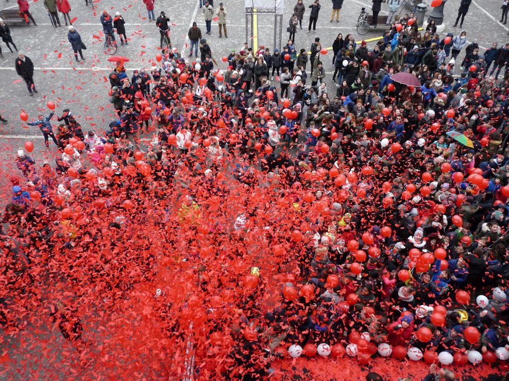 Centinaia di palloncini in volo sulle note del Barbiere di Siviglia. Si sono aperte così le celebrazioni per il 150esimo di Rossini, cadenzate dall’addio alle auto in piazza del Popolo. Con Matteo Ricci a posare simbolicamente l’ultima sfera che delimita l’area pedonale, insieme ai bambini delle scuole pesaresi, lungo la linea che parte dal palazzo delle Poste e arriva al municipio.