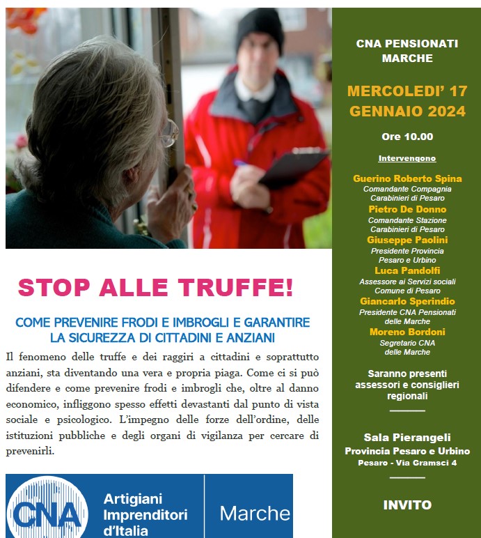 “Stop alle truffe. Come prevenire frodi e imbrogli e garantire la sicurezza di cittadini e anziani”. E’ questo il titolo del convegno che vedrà gli interventi di Guerino Roberto Spina comandante della Compagnia carabinieri di Pesaro; Pietro De Donno Comandante della Stazione carabinieri di Pesaro; Giuseppe Paolini Presidente della Provincia di Pesaro e Urbino; Luca Pandolfi Assessore ai Servizi Sociali del Comune di Pesaro; Giancarlo Sperindio Presidente Cna Pensionati Marche e Moreno Bordoni Segretario Cna Marche. Saranno inoltre presenti Assessori e Consiglieri regionali.
