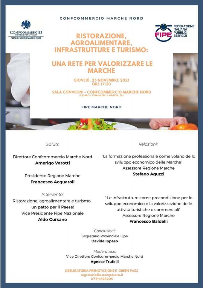‘Ristorazione, agroalimentare, infrastrutture e turismo: una rete per valorizzare le Marche’ è il titolo dell’interessante convegno organizzato da Confcommercio Marche Nord e Fipe (Federazione Italiana Pubblici Esercizi), in programma il 25 novembre alle ore 17.30 a Pesaro, presso la sala convegni dell’associazione.
