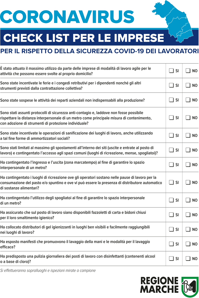 Si effettueranno ispezioni mirate a campione o su segnalazione e a tal fine è stata predisposta una check list, che si rende nota, in quanto, afferma il presidente, “è utile alle imprese per comprendere se sono a norma rispetto alla sicurezza sanitaria ed è utile ai lavoratori, perché li rende ulteriormente consapevoli rispetto ai comportamenti da tenere sui luoghi di lavoro”.