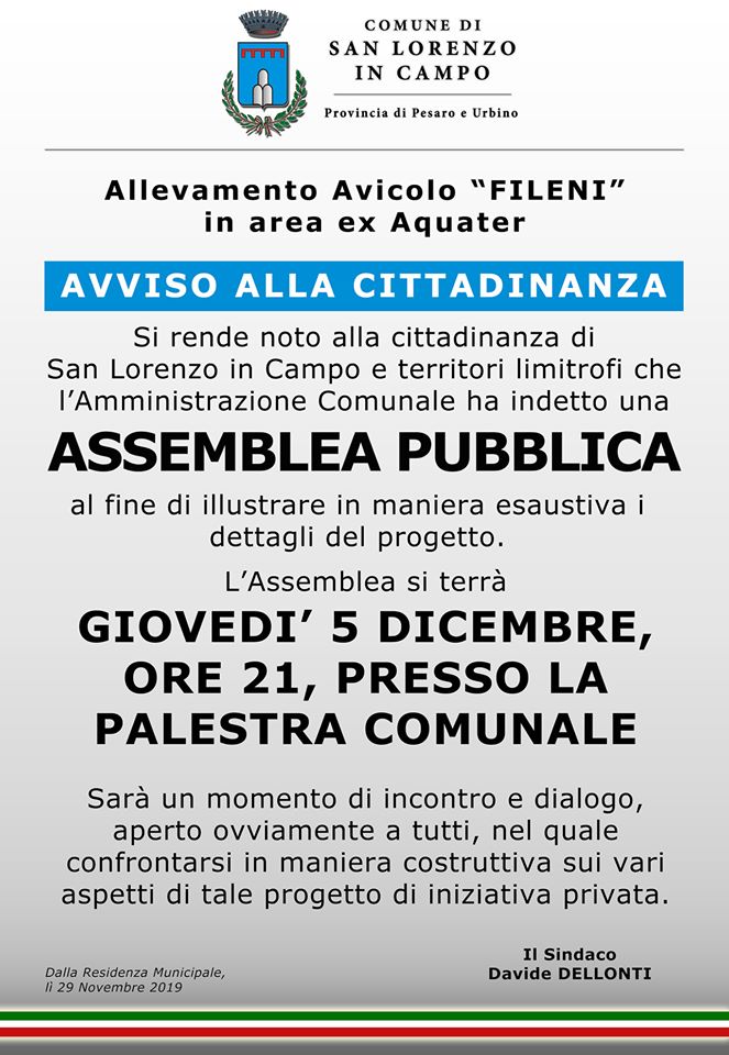 Come annunciato qualche giorno fa dal sindaco, l’amministrazione comunale ha reso noto data e luogo dell’assemblea pubblica per approfondire il progetto dell’azienda Fileni, che prevede la realizzazione di un allevamento avicolo nell’area ex Aquater. E’ in programma giovedì alle 21 presso la palestra comunale. «L’assemblea – spiega il sindaco Davide Dellonti – sarà finalizzata ad illustrare in maniera esaustiva tutti i dettagli del progetto, dare risposte ai legittimi interrogativi che la popolazione si sta ponendo, nonché chiarire aspetti procedurali. Vista l’importanza dell’argomento, è stata scelta una modalità operativa ed organizzativa finalizzata a dare la più ampia possibilità a tutti di partecipare all’assemblea, che sarà aperta ovviamente anche ai cittadini dei territori limitrofi. Sarà un momento di incontro e dialogo, aperto ovviamente a tutti, nel quale confrontarsi in maniera costruttiva sui vari aspetti di tale progetto di iniziativa privata». Saranno presenti esponenti dell’azienda Fileni, tecnici ed un professore universitario, esponenti dei vari enti locali coinvolti, l’amministrazione laurentina e anche il comitato AmbienteVivo Valcesano: «Dopo aver parlato con rappresentanti del comitato, c’è da parte nostra assoluta disponibilità a far intervenire il comitato stesso in maniera attiva, con la finalità che il confronto possa essere il più ampio ed esaustivo possibile. Ci auguriamo tutti che questo momento di incontro possa essere vissuto da ognuno come costruttivo e sereno, al fine di poter effettuare un confronto serio su tutti gli aspetti del progetto e ricadute sul territorio. Ribadiamo infine che ogni altro passaggio formale dell’iter autorizzativo della Valutazione d’impatto ambientale regionale, nonché dei vari endo-procedimenti, sarà puntualmente comunicato ufficialmente dalla nostra amministrazione comunale».
