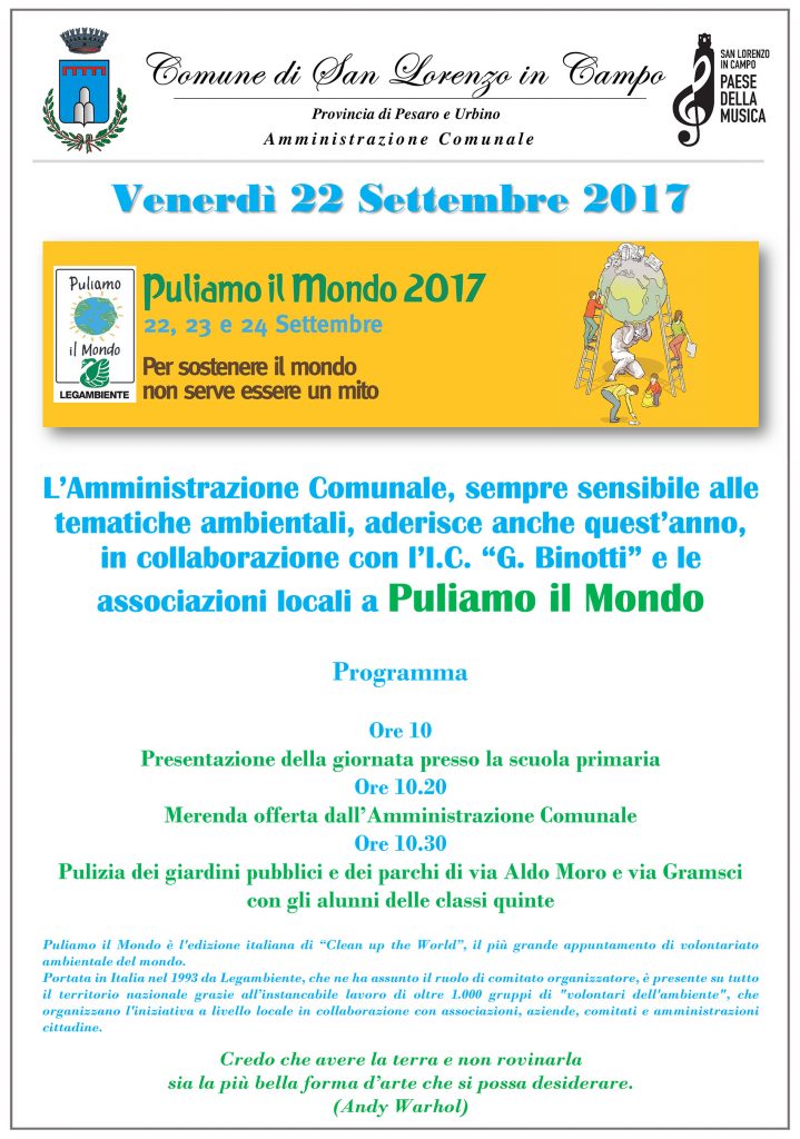 L’amministrazione comunale, sempre sensibile alle tematiche ambientali, aderisce anche quest’anno, in collaborazione con l’Istituto comprensivo “G. Binotti” e le associazioni locali a “Puliamo il Mondo”. L’appuntamento è per venerdì 22 settembre. Puliamo il Mondo è l’edizione italiana di “Clean up the World”, il più grande appuntamento di volontariato ambientale del mondo. Portata in Italia nel 1993 da Legambiente, che ne ha assunto il ruolo di comitato organizzatore, è presente su tutto il territorio nazionale grazie all’instancabile lavoro di oltre 1.000 gruppi di “volontari dell’ambiente”.