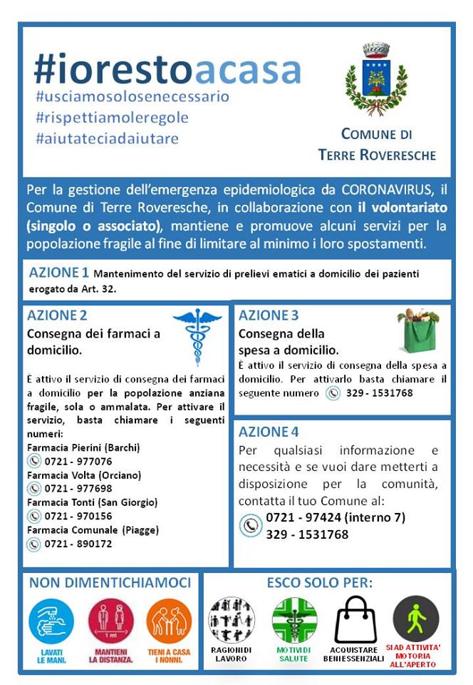 Anche il Comune di Terre Roveresche, per la gestione dell’emergenza epidemiologica da CORONAVIRUS, utilizzando i propri dipendenti e in collaborazione con associazioni di volontariato, volontari singoli e cittadini, sta mantenendo e promuovendo alcuni servizi per la popolazione fragile e sola al fine di limitare al minimo i loro spostamenti.