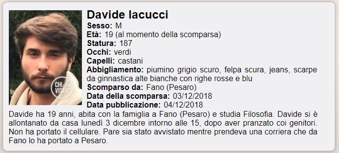 Davide Iacucci, 19 anni, si è allontanato da casa lunedì pomeriggio intorno alle 15, dopo aver pranzato con i genitori. Questo quanto riporta il sito ‘Chi l’ha visto’: “Davide ha 19 anni, abita con la famiglia a Fano (Pesaro) e studia Filosofia. Davide si è allontanato da casa lunedì 3 dicembre intorno alle 15, dopo aver pranzato coi genitori. Non ha portato il cellulare. Pare sia stato avvistato mentre prendeva una corriera che da Fano lo ha portato a Pesaro”.