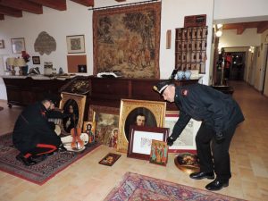 Dopo un rapido sopralluogo i militari hanno potuto constatare che l’intero piano terra composto dalla hall, da uffici di servizio, un lungo corridoio e il salone ristorante, era stato interamente spogliato dai suoi arredi: 2 violini, dieci quadri, 5 icone antiche in legno raffiguranti immagini sacre, 5 lampade da tavolo, un candelabro in ottone, un arco antico in legno e altri oggetti antichi costituenti l’arredamento dell’immobile, del valore complessivo di circa 20.000 euro, materiale riposto tutto sul pavimento. Nulla però è stato portato via, la refurtiva è stata interamente riconsegnata nelle mani del proprietario. Di lì a poco i due avrebbero riposto quanto trafugato a bordo di una Kia Ceed SW di colore grigio di proprietà dell’italiano, rinvenuta a pochi metri dall’ingresso della struttura, per poi allontanarsi definitivamente.