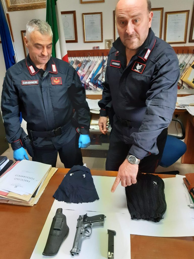 Unitamente al Nucleo Operativo di Fano è stato predisposto quindi un servizio di osservazione presso le rispettive abitazioni; solo in tarda serata, al loro rientro a casa sono scattate le perquisizioni. Nella camera da letto del più giovane è stata trovata la somma di euro 700, mentre all’interno di una piccola rimessa situata nel cortile della sua abitazione, ma di proprietà di un vicino, è stata trovata all’interno di un passamontagna la pistola del tipo Beretta, finta ma in ferro, quindi perfettamente identica al modello reale; nascondiglio lontano da occhi indiscreti e con ogni probabilità scelto in quanto raggiungibile ma non a lui direttamente riconducibile.
