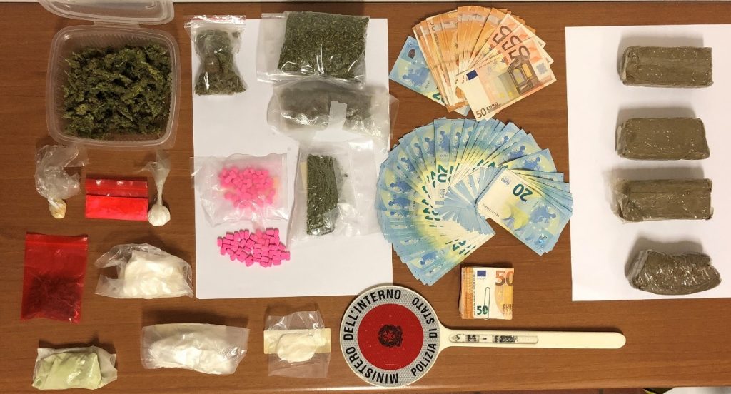 In tale contesto l’attenzione degli agenti della Squadra Mobile, entrati nell’abitazione del sospettato per un controllo, veniva attirata dal nitido odore di hascisc che via aleggiava. Gli ulteriori approfondimenti consentivano di rinvenire sul tavolo della sala da pranzo quattro “panette” di hascisc del peso complessivo di circa 800 grammi. Inoltre venivano recuperati ulteriori quantitativi di sostanze stupefacenti occultati in vari punti della stessa stanza ed in particolare: gr. 130 circa di marijuana, gr.10 circa di cocaina, nonché la somma in contante di euro 2.600 circa, ritenuta essere il provento dello spaccio. All’interno del vano congelatore del frigorifero veniva rinvenuto un involucro contenente diverse tipologie di anfetamine per un peso di gr. 230 circa e n.95 pasticche di ecstasy/MDMA di un singolare colore “fucsia”, riportanti su un lato l’effige di un toro sull’altro la scritta “Red Buli”, per un peso complessivo di gr. 50 circa.