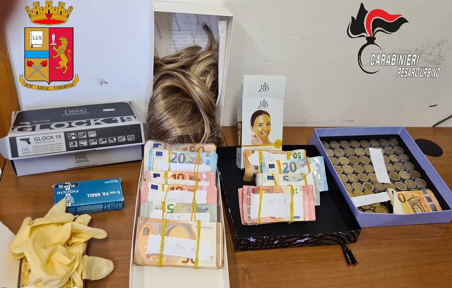 Ci sono volute alcune ore perché carabinieri e poliziotti rintracciassero i due uomini che, assenti dalle rispettive residenze, avevano cercato riparo, per sottrarsi all’arresto, in un residence della città. Nell’appartamento individuato dagli operanti, uno dei due ricercati si è anche nascosto sotto un letto, mentre l’altro nel bagno. Nel corso della perquisizione all’interno dell’abitazione, gli investigatori hanno rinvenuto parte del bottino della rapina, circa 15.000 euro in banconote di vario taglio, oltre ad altre parrucche verosimilmente utilizzate per il compimento di fatti analoghi. Viste le circostanze, i due soggetti sono stati dichiarati in stato di fermo di indiziati di delitto e sono quindi stati associati presso la casa circondariale di Pesaro, come disposto dalla Procura della Repubblica presso il Tribunale di Pesaro, che ha coordinato tutte le fasi investigative, in attesa dell’udienza di convalida che si terrà nelle prossime ore.