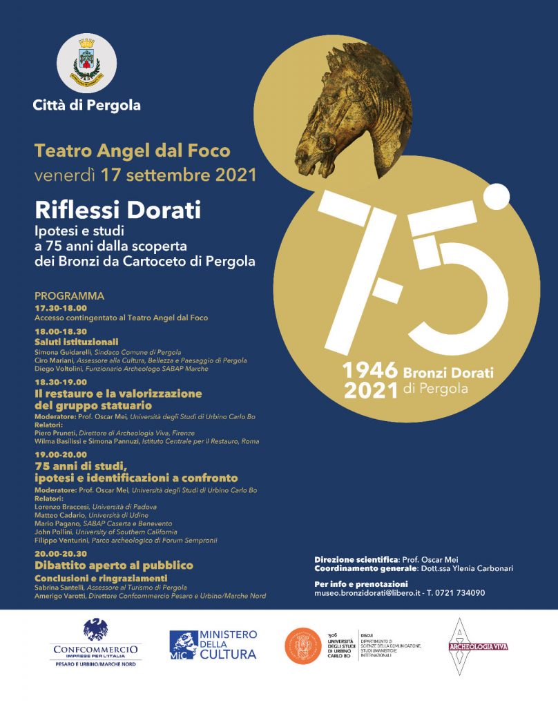 In occasione di questa ricorrenza, l’Amministrazione comunale e in particolare l’Assessore alla Cultura, Bellezza e Paesaggio di Pergola, Ciro Mariani e l’Assessore al Turismo, Sabrina Santelli, in collaborazione con Confcommercio Marche Nord, hanno dato vita ad alcune importanti iniziative: il nuovo catalogo del Museo dei Bronzi Dorati e della Città di Pergola, la mostra d’arte ‘Imperatori in Bronzo’ dello scultore olandese J. Van Der Lann visitabile fino al 24 ottobre al museo ed il convegno ‘Riflessi dorati. Ipotesi e studi a 75 anni dalla scoperta dei Bronzi da Cartoceto di Pergola’. L’appuntamento è in programma venerdì 17 settembre alle ore 18, nella splendida cornice del teatro Angel Dal Foco.