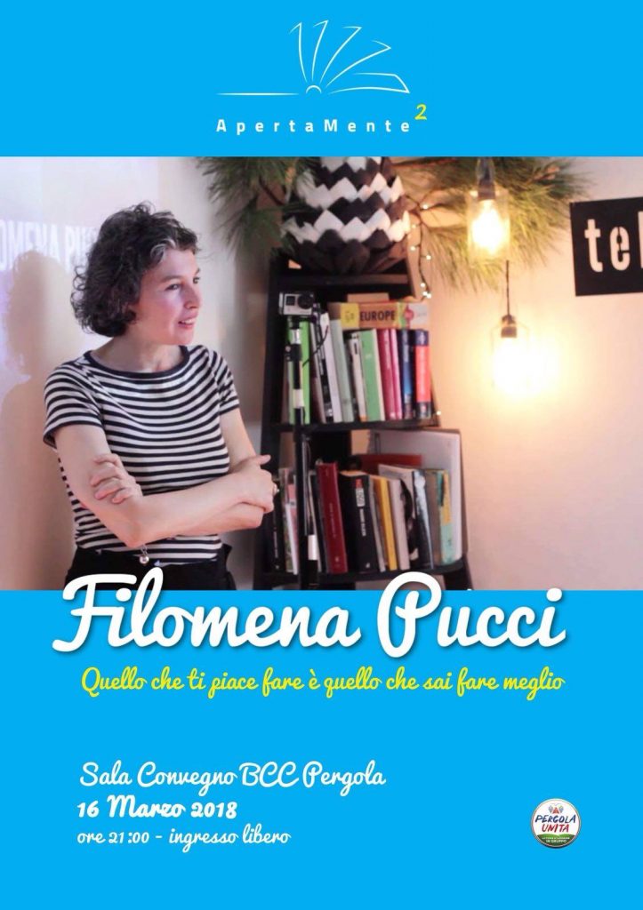 “Ripartiamo con grande entusiasmo, e lo facciamo scegliendo come primo incontro un tema veramente importante: la donna e il fare impresa.” dice Sabrina Santelli, tra gli ideatori di ApertaMente e vice presidente di Pergola Unita. “Incontreremo Filomena Pucci scrittrice ed ex autrice televisiva, e con lei parleremo di donne, di lavoro, di vita e di tutto quello che è nel suo libro “Appassionate: storie donne imprese”.