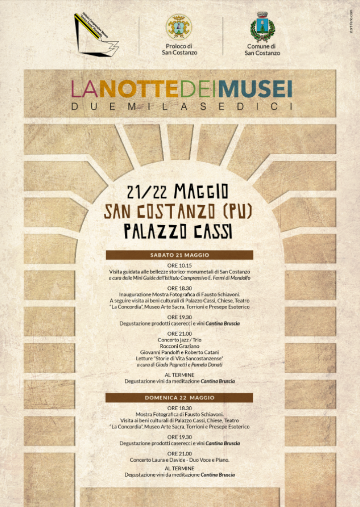 In collaborazione con il Comune di San Costanzo organizza “ La Notte dei Musei” che si svolgerà dal 21al 22 maggio animando le bellezze storico culturali del centro storico da Palazzo Cassi, al Teatro La Concordia,al Museo di Arte Sacra,alle Chiese, ai Torrioni con lo scopo di rendere i beni immateriali protagonisti di un nuovo modello di conoscenza e promozione del territorio abbinando la cultura alle prelibatezze enogastronomiche che saranno offerte ai visitatori in un contesto iridescente che contempla per la serata di sabato esibizioni musicali di Jazz a cura del Trio Rocconi,Pandolfi,Catani e lettura di storie del’900 con Giada Pagnetti e Pamela Donati per proseguire domenica sera con il duo musicale Laura e Davide.