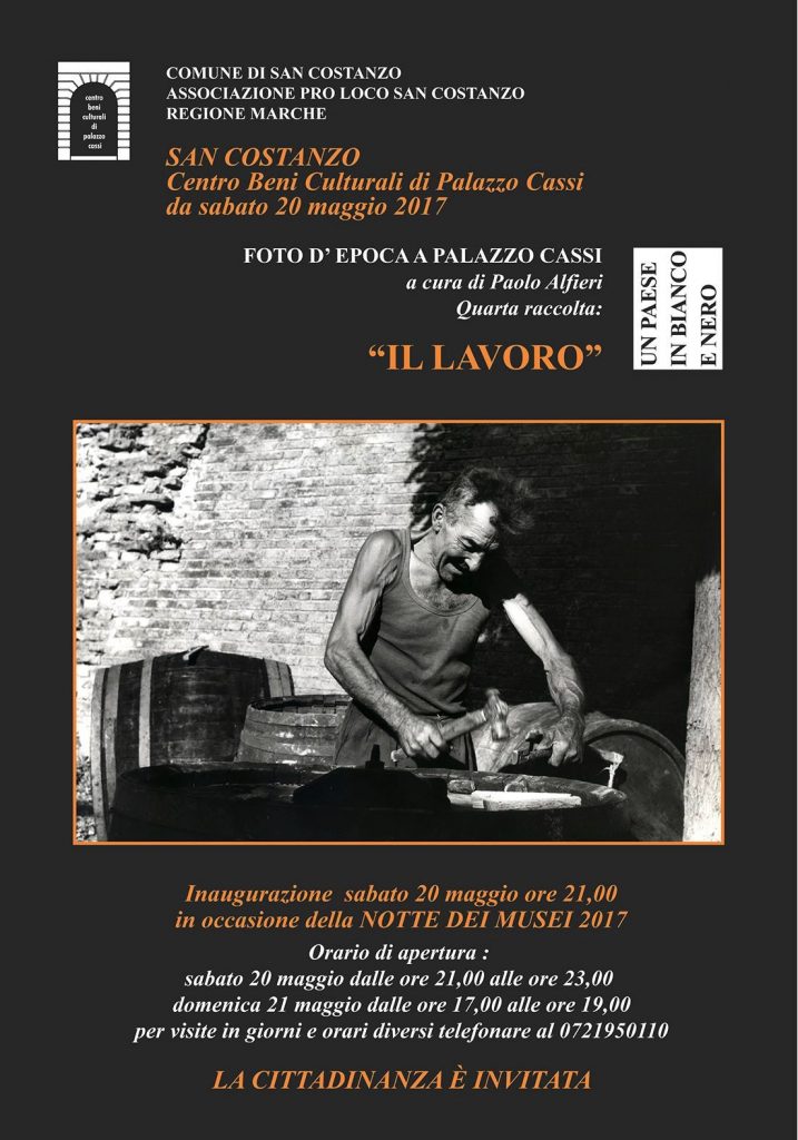 Sempre sabato 20 alle ore 21 a Palazzo Cassi (presso la sala esposizioni fotografiche: Un paese in bianco e nero) per dare il via alla NOTTE DEI MUSEI 2017 verrà inaugurata la mostra “Narrare il lavoro attraverso le immagini del ‘900”, raccolta fotografica a cura di Paolo Alfieri sulle immagini del lavoro e dei mestieri dagli anni ’30 agli anni ’60. La mostra è organizzata in collaborazione con la Pro Loco di San Costanzo ed è la quarta raccolta del nostro instancabile ricercatore d’immagini.