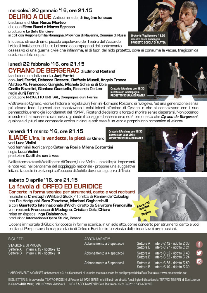 Si partirà mercoledì 20 gennaio alle 21.15, con “Delirio a due”, anticommedia di Eugène Ionesco. Regia e interpretazione, scene e costumi Elena Bucci e Marco Sgrosso; produzione “Le Belle Bandiere”, in collaborazione con Regione Emilia Romagna, Provincia di Ravenna, Comune di Russi. In questo straordinario, piccolo capolavoro del Teatro dell’Assurdo i ridicoli battibecchi di Lui e Lei sono accompagnati dal controcanto ossessivo di una guerra civile che infiamma, al di fuori del nido protetto, dove si consuma la vacua, tragicomica esistenza della coppia. Per il progetto Scuola di platea, incontro con Elena Bucci e Marco Sgrosso presso la sala dell’oratorio l’Aquilone alle 18.30, In collaborazione con Il Liceo Scientifico “G. Torelli”, sede di Pergola.
