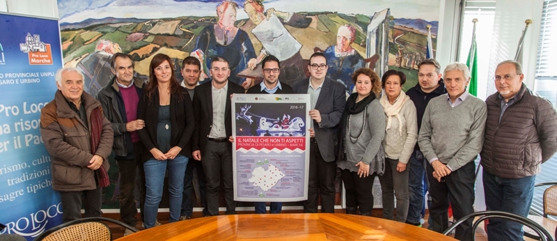 Per il Natale 2016 le pro loco e i Comuni della provincia di Pesaro e Urbino, in collaborazione con la Regione Marche, la Provincia Pesaro Urbino e in accordo con Christkindlmarkt Mercatino di Natale Bolzano Bozen, si sono riuniti per valorizzare le peculiarità di ogni territorio, puntando sull’artigianato artistico e sulle tipicità enogastronomiche, che si affiancano alle bellezze storiche, artistiche, culturali e architettoniche di cui la provincia è ricca. E’ stata così riproposta la campagna “Il Natale che non ti aspetti”, promossa quest’anno dal Comitato provinciale Unpli (Unione nazionale delle Pro loco d’Italia) ed inserita dalla Regione Marche nel “Piano triennale di promozione turistica 2016-2018”. Una serie di eventi unici nel loro genere, che fanno della provincia di Pesaro e Urbino la realtà del centro Italia più organizzata sul versante dei mercatini e delle iniziative natalizie. Ne hanno parlato in conferenza stampa il presidente provinciale Unpli Damiano Bartocetti, il presidente della Provincia Daniele Tagliolini e numerosi rappresentanti delle pro loco interessate.