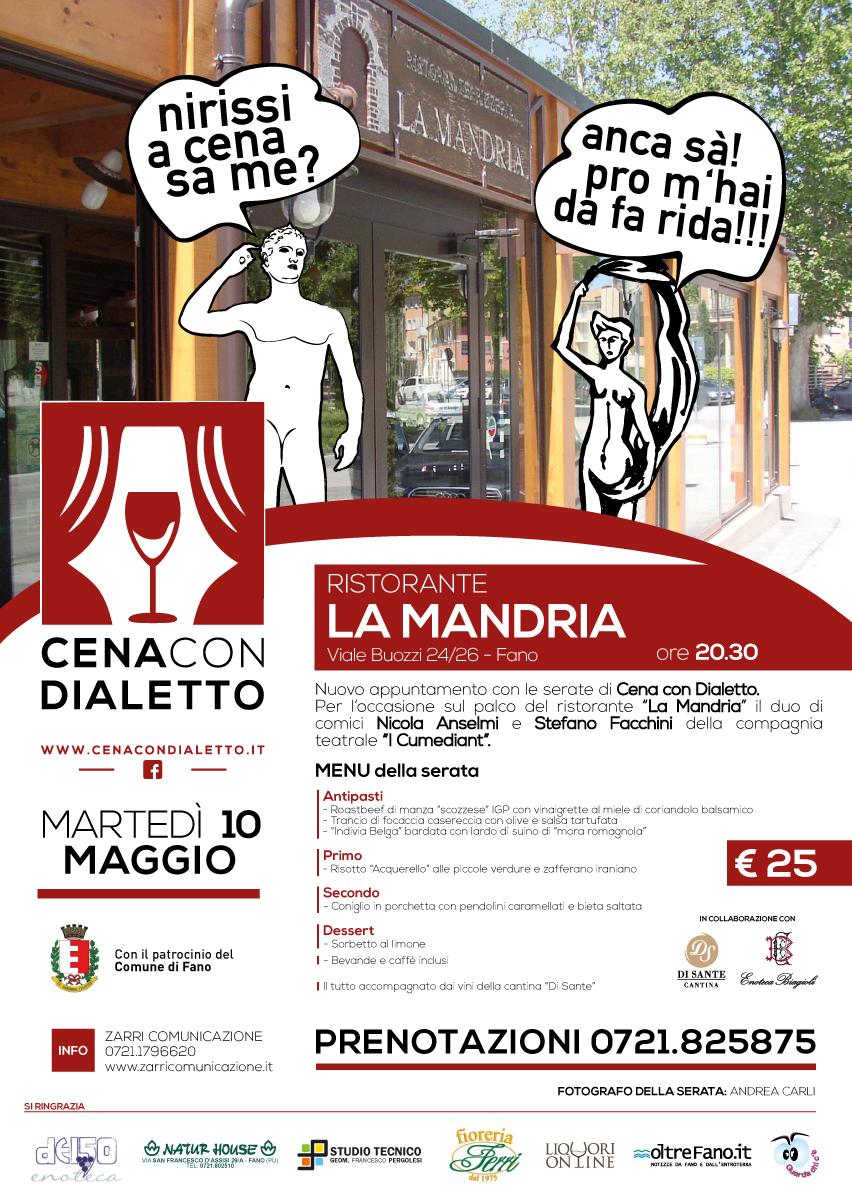 Se ne vedranno delle belle martedì 10 maggio 2016 alle ore 20.30 al Ristorante La Mandria di Fano, dove andrà in scena l’ottavo appuntamento di ‘Cena con Dialetto’, le cene spettacolo organizzate dall’agenzia Zarri Comunicazione, con la direzione artistica di Nicola Anselmi, che hanno di recente ottenuto il patrocinio del Comune di Fano.