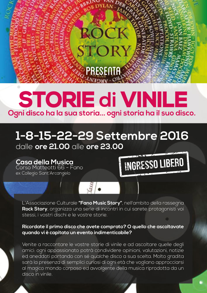 Giovedì 1 settembre alle ore 21 riprende la rassegna Storie di Vinile dedicata agli appassionati di musica riprodotta da questo storico supporto fonografico, sono invitati ad essere protagonisti delle serate gli appassionati che, portandosi qualche disco da casa, ne condividano le caratteristiche e la storia. Gli incontri si terranno presso la Casa della Musica di Fano, organizzati dall’Associazione Culturale “Fano Music Story”. La rassegna si protrarrà con un appuntamento settimanale per tutto il mese di settembre (1-8-15-22-29). Alla Casa della Musica sono esposti rari reperti legati alla musica moderna (19 dischi in gommalacca degli anni ’30, ’40 e ’50, 2 fonovalige Lesa anni ’60, un microfono originale Reslosound, “gemello” di quello che utilizzarono The Beatles nei primi anni di attività e altre curiosità). Nella struttura sono a disposizione due sale prove gratuite, una mostra permanente di locandine di film musicali e una esposizione di immagini relative a storici musicisti di Fano degli anni ’30 ’40 ’50 ’60 e ’70. Ingresso libero e gratuito.