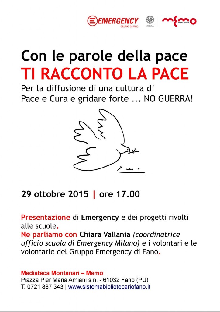 Giovedì 29 ottobre 2015 alle ore 17.00 alla Memo si svolgerà l’incontro “Con le parole della pace” a cura dell’associazione Emergency Fano.