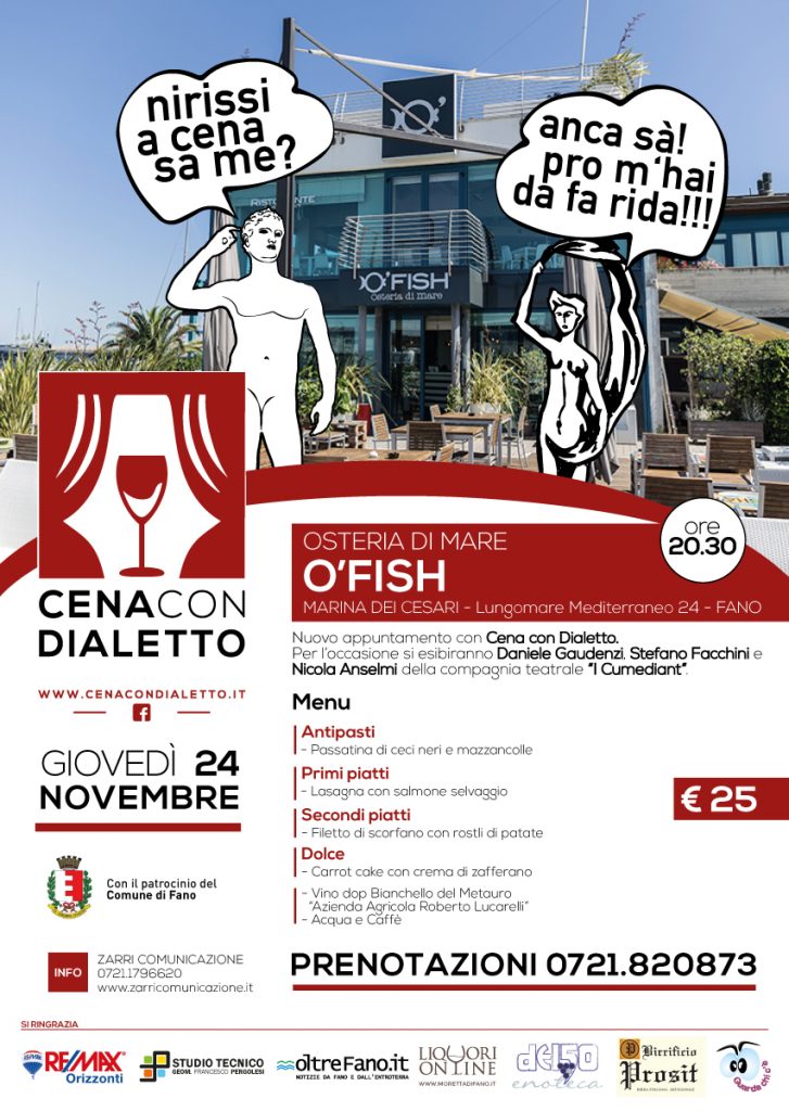 Alla Cena con Dialetto di questa sera all’osteria di mare O’Fish sbarcheranno Nicola Anselmi, Stefano Facchini e Daniele Gaudenzi della compagnia teatrale dialettale ‘I Cumediant’. L’appuntamento è per le 20,30 al ristorante sul mare all’interno della Marina dei Cesari. (Per prenotazioni:0721/820873) .