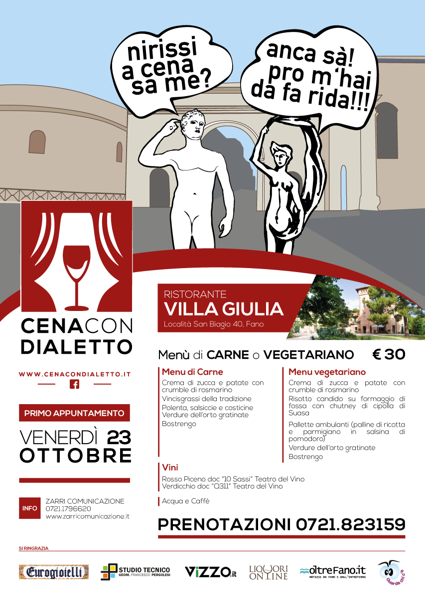 L’immaginario invito a cena tra il Lisippo e la Dea della Fortuna è l’idea nata dalla creatività di Nicola Zarri, titolare dell’omonima agenzia, per lanciare il primo appuntamento di “Cena con dialetto”, le serate evento che da ottobre saranno un appuntamento fisso mensile dedicato agli amanti del buon cibo e agli estimatori del dialetto fanese. Protagonista assoluto il connubio tra dialetto e piatti tipici locali per serate all’insegna del mangiar bene e di qualità e del divertimento.