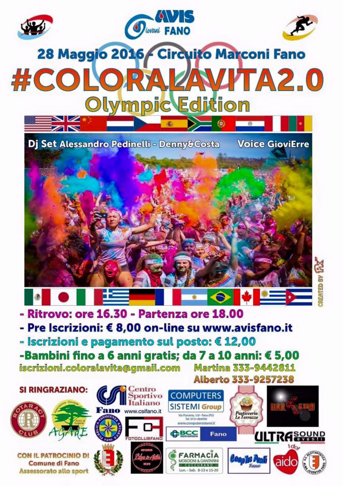 Sabato 28 Maggio, presso il Circuito Marconi, il gruppo Giovani di AVIS Fano ripropone, con il patrocinio del Comune di Fano, #COLORALAVITA 2.0 Olympic Edition, una “corsa” colorata per promuovere il benessere, la felicità e fare in modo che tutti possano divertirsi; il ritrovo è previsto dalle ore 16,30 con partenza alle ore 18,00. Ai partecipanti, al momento della registrazione verrà consegnato un kit con: maglietta, 2 sacche di colori e una fascetta colorata. Sono graditi gadget e indumenti sportivi che rappresentino le olimpiadi, tema di sfondo della manifestazione