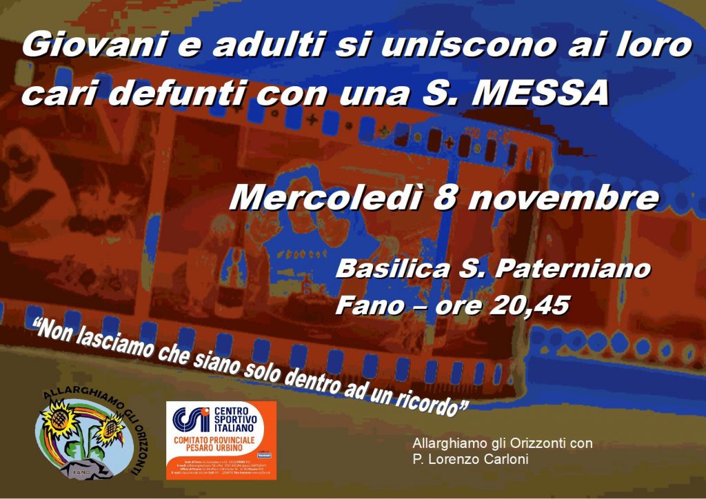 FANO – Si celebrerà domani, mercoledì 8 novembre alle ore 20,45, nella chiesa di San Paterniano la messa in ricordo dei defunti organizzata dall’associazione Allarghiamo gli Orizzonti e dal CSI Fano.
