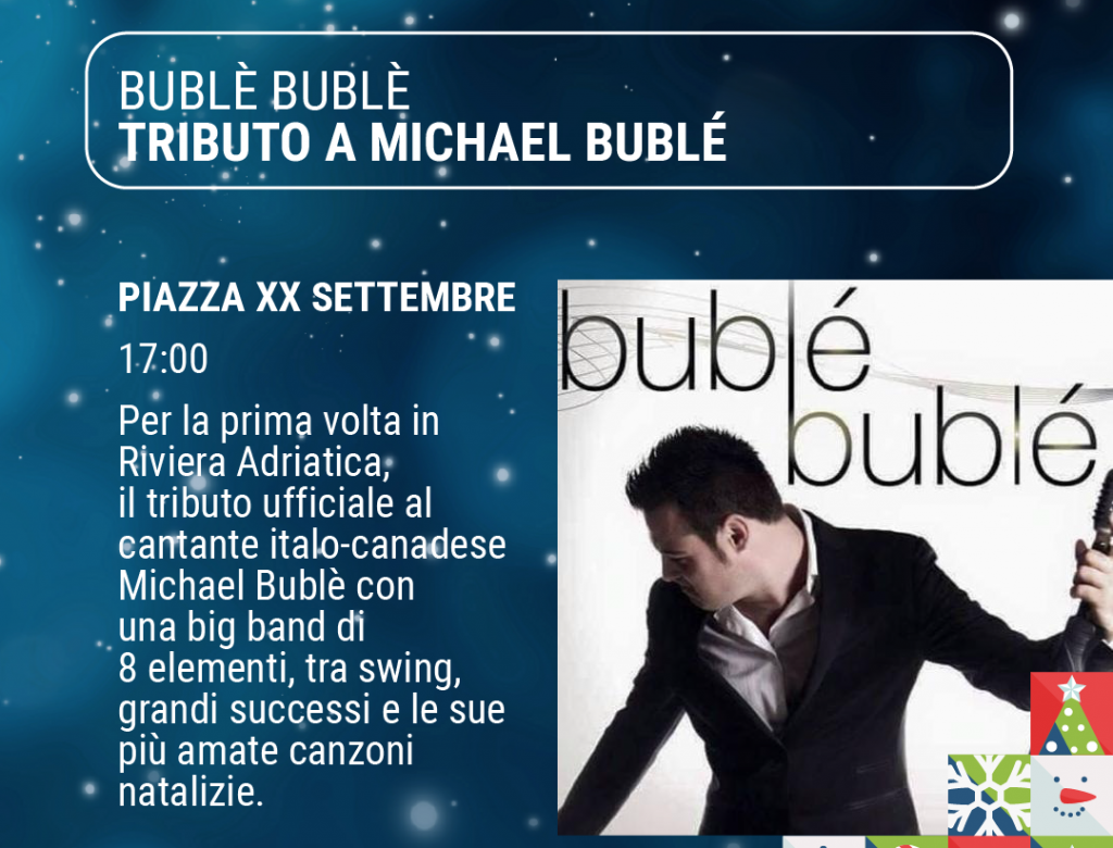 Domenica 21, sempre sotto l’albero in Piazza XX Settembre alle 17, l’atmosfera verrà accesa da un evento speciale: per la prima volta sulla Riviera Adriatica arriva Bublé Bublé, la big band ufficiale dedicata all’icona italo-canadese Michael Bublé. Otto musicisti sul palco daranno vita a un elegante e coinvolgente tributo tra swing, atmosfere jazz e i grandi classici natalizi dell’artista, in un concerto pensato per emozionare e avvolgere il pubblico in un abbraccio musicale. Lo spettacolo è pensato per tutte le età e promette un’esperienza emozionante e avvolgente, in cui musica, atmosfera e suggestione si incontrano nella cornice più suggestiva del Natale fanese. Un appuntamento da vivere con il cuore aperto, in famiglia, tra amici, o semplicemente per lasciarsi trasportare dal ritmo raffinato che ha reso Bublé un simbolo mondiale delle festività.