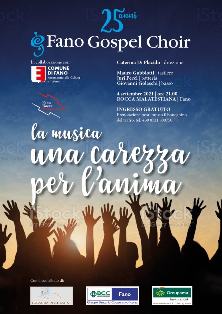 Il Fano Gospel Choir festeggia 25 anni di passione per la musica gospel, con il concerto “La musica UNA CAREZZA PER L’ANIMA” che si terrà sabato 4 settembre alle ore 21.15 alla Rocca Malatestiana di Fano (in caso di maltempo, l’evento verrà posticipato al 5 settembre), in collaborazione con Comune di Fano, assessorato alla Cultura e la Rocca Malatestiana.