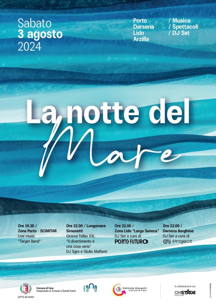 -**Sabato 3 agosto** – **Ore 18.00 / Zona Porto (Darsena Giurgi)** – Apertura stand gastronomici – Menù tipici della cucina marinara dei pescatori di Fano – **Ore 18.30 / IAT Porto** – FANO MARINARA – Visite Guidate al percorso della Marineria Fanese – A cura dell’Associazione Il Ridosso – **Ore 19.30 / Zona Porto – SCIMITAR** – Live music “Target Band” – **Ore 19.30 / Spazio antistante “La Cava” del Lido lato mare Via Simonetti** – Angolo gioco-didattico per bambini “Alla scoperta del mare e delle tradizioni marinare” (fino alle ore 22:00) – **Ore 21.00 / Monumento ai Caduti del Mare** – Convegno “Interazioni delle correnti marine lungo la costa fanese: scenari attuali e futuri” – A cura dell’Associazione Gente di Mare in collaborazione con l’Ente Carnevalesca – Spettacolo teatrale “Il Mare: racconti e passioni” a cura dell’Associazione Teatro del Sorriso – **Ore 22.00 / Zona Lido “Largo Seneca”** – DJ Set a cura di PORTO FUTURO – **Ore 22.00 / Lungomare Simonetti** – Groove Fellas XXL – “Il divertimento è una cosa seria” – DJ Sgro e Giulio Malfanti